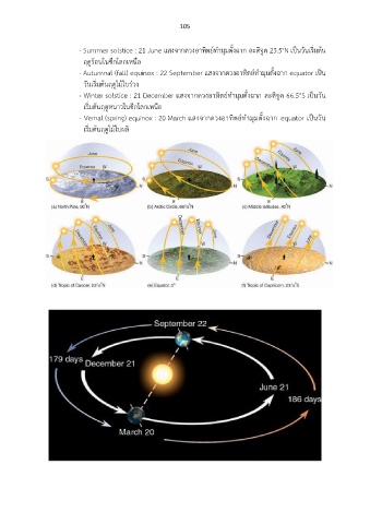 - Autumnal (fall) equinox : 22 September แสงจากดวงอาทิตย์ท้ามุมตั้งฉาก equator เป็น
