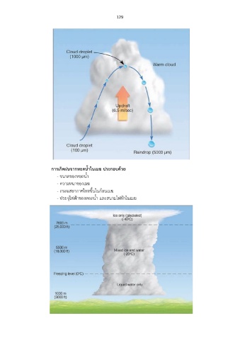 129 การเกิดฝนจากหยดน้้าในเมฆ ประกอบด้วย - ขนาดของหยดน้้า - ความหนาของเมฆ - กระแสอากาศไหลขึ้นในก้อนเมฆ - ประจุไฟฟ้าของหยดน้้า และสนามไฟฟ้าในเมฆ