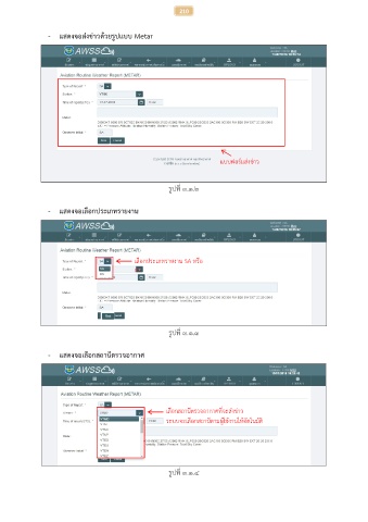 210 - แสดงจอส่งข่าวด้วยรูปแบบ Metar แบบฟอร์มส่งข่าว รูปที่ ๓.๑.๒ - แสดงจอเลือกประเภทรายงาน เลือกประเภทรายงาน SA หรือ RS รูปที่ ๓.๑.๓ - แสดงจอเลือกสถานีตรวจอากาศ เลือกสถานีตรวจอากาศที่จะส่งข่าว ระบบจะเลือกสถานีตามผู้ใช้งานให้อัตโนมัต ิ รูปที่ ๓.๑.๔