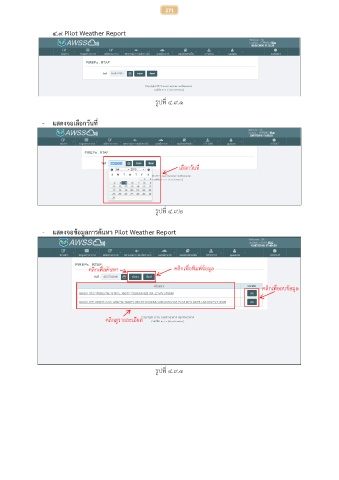 271 ๔.๙ Pilot Weather Report รูปที่ ๔.๙.๑ - แสดงจอเลือกวันที่ เลือกวันที่ รูปที่ ๔.๙.๒ - แสดงจอข้อมูลการค้นหา Pilot Weather Report คลิกเพื่อค้นหา คลิกเพื่อพิมพ์ข้อมูล คลิกเพื่อลบข้อมูล คลิกดูรายละเอียด รูปที่ ๔.๙.๓