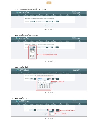 273 ๔.๑๐ ผลการตรวจอากาศลมชั้นบน (PIBAL) รูปที่ ๔.๑๐.๑ - แสดงจอเลือกสถานีตรวจอากาศ เลือกสถานีตรวจอากาศ ี่ รูปท ๔.๑๐.๒ - แสดงจอเลือกวันที่ เลือกวันที่ รูปที่ ๔.๑๐.๓ - แสดงจอเลือกเวลา คลิกเพื่อค้นหา เลือกเวลา รูปที่ ๔.๑๐.๔