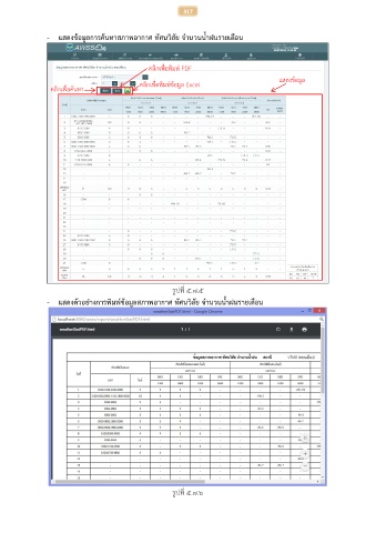 317 - แสดงข้อมูลการค้นหาสภาพอากาศ ทัศนวิสัย จ้านวนน้้าฝนรายเดือน คลิกเพื่อพิมพ์ PDF แสดงข้อมูล ้ คลิกเพื่อพิมพ์ขอมูล Excel คลิกเพื่อค้นหา รูปที่ ๕.๗.๕ - แสดงตัวอย่างการพิมพ์ข้อมูลสภาพอากาศ ทัศนวิสัย จ้านวนน้้าฝนรายเดอน ื รูปที่ ๕.๗.๖