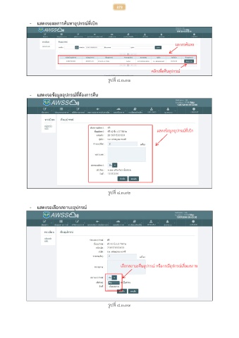 373 - แสดงจอผลการค้นหาอุปกรณ์ที่เบิก ผลการค้นหา คลิกเพื่อคืนอุปกรณ์ รูปที่ ๘.๓.๓๑ - แสดงจอข้อมูลอุปกรณ์ที่ต้องการคืน แสดงข้อมูลอุปกรณ์ที่เบิก รูปที่ ๘.๓.๓๒ - แสดงจอเลือกสถานะอุปกรณ์ เลือกสถานะคืนอุปกรณ์ หรือกรณีอุปกรณ์เสื่อมสภาพ รูปที่ ๘.๓.๓๓
