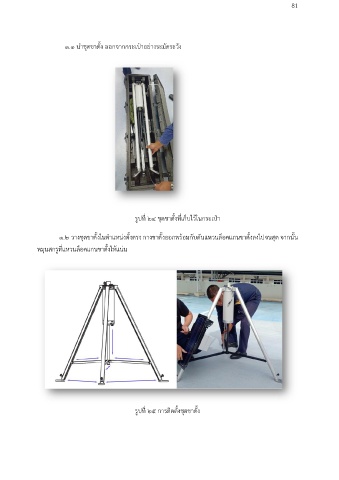 81 ๋ ุ ๑.๑ นำชดขาตั้ง ออกจากกระเปาอย่างระมัดระวัง รูปที่ ๒๔ ชุดขาตั้งที่เก็บไว้ในกระเป๋า ุ ั ั ๑.๒ วางชุดขาตั้งในตำแหน่งต้งตรง กางขาตั้งออกพร้อมกับดันแหวนล็อคแกนขาต้งลงไปจนสด จากนั้น ี่ หมุนสกรูทแหวนล็อคแกนขาตั้งให้แน่น รูปที่ ๒๕ การติดตั้งชุดขาตั้ง