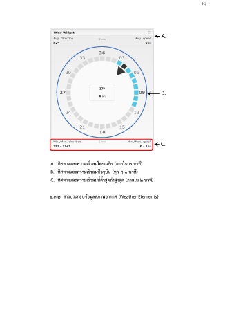 94 A. B. C. A. ทิศทางและความเร็วลมโดยเฉลี่ย (ภายใน ๒ นาที) B. ทิศทางและความเร็วลมปัจจุบัน (ทุก ๆ ๑ นาที) C. ทิศทางและความเร็วลมที่ต่ำสุดถึงสูงสุด (ภายใน ๒ นาที) ๑.๓.๒ สารประกอบข้อมูลสภาพอากาศ (Weather Elements)