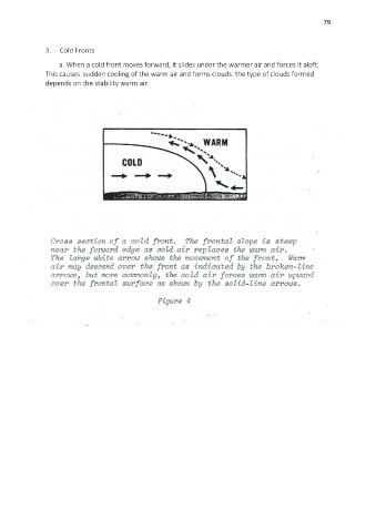 79 3. Cold Fronts a. When a cold front moves forward, it slides under the warmer air and forces it aloft. This causes sudden cooling of the warm air and forms clouds. the type of clouds formed depends on the stability warm air.