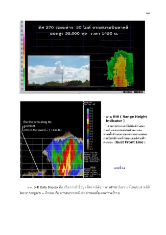 ๒๓ ๑๓. 3-D Data Display คือ เป็นการนำข้อมูลที่ตรวจได้จากภาพPPIมาวิเคราะห์ในแบบสามมิติ โดยจะปรากฏภาพ ๓ ลักษณะ คือ ภาพแนวราบระดับต่ำ ภาพแนวตั้งและภาพระดับบน