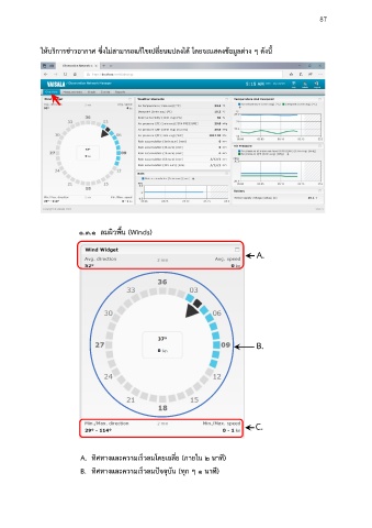 87 ให้บริการข่าวอากาศ ซึ่งไม่สามารถแก้ไขเปลี่ยนแปลงได้ โดยจะแสดงข้อมูลต่าง ๆ ดังนี ๑.๓.๑ ลมผิวพื น (Winds) A. B. C. A. ทิศทางและความเร็วลมโดยเฉลี่ย (ภายใน ๒ นาที) B. ทิศทางและความเร็วลมปัจจุบัน (ทุก ๆ ๑ นาที)
