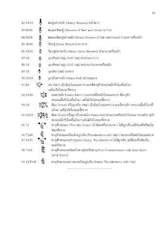 94 XXGR หิมะ (Snow) หรือลูกเห็บตกหนัก (Heavy Hail) ปานกลางหรือหนักในขณะ ตรวจมีพายุฟา