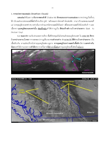 1.1 หมอก/St รวมกัน ส่วนยอดราบเรียบ พื้นที่ปกคลุมเป็นไปตามลักษณะภูมิประเทศ ใน ภาพ VIS สีขาว